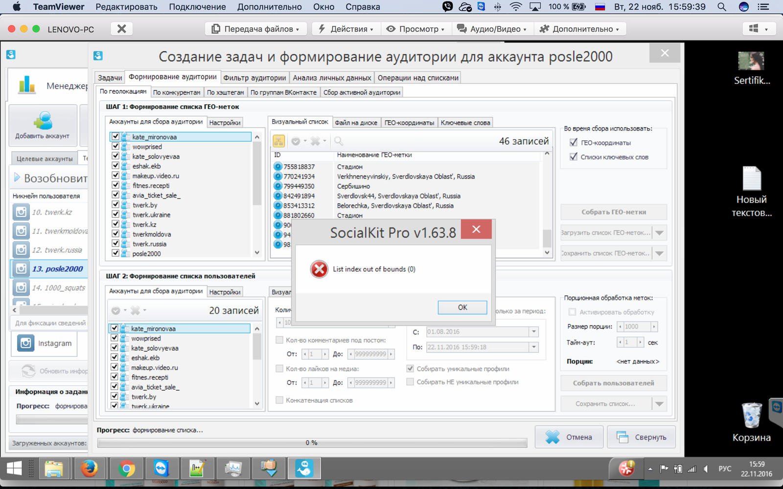 При попытке сбора пользователей со списка ГЕО-меток