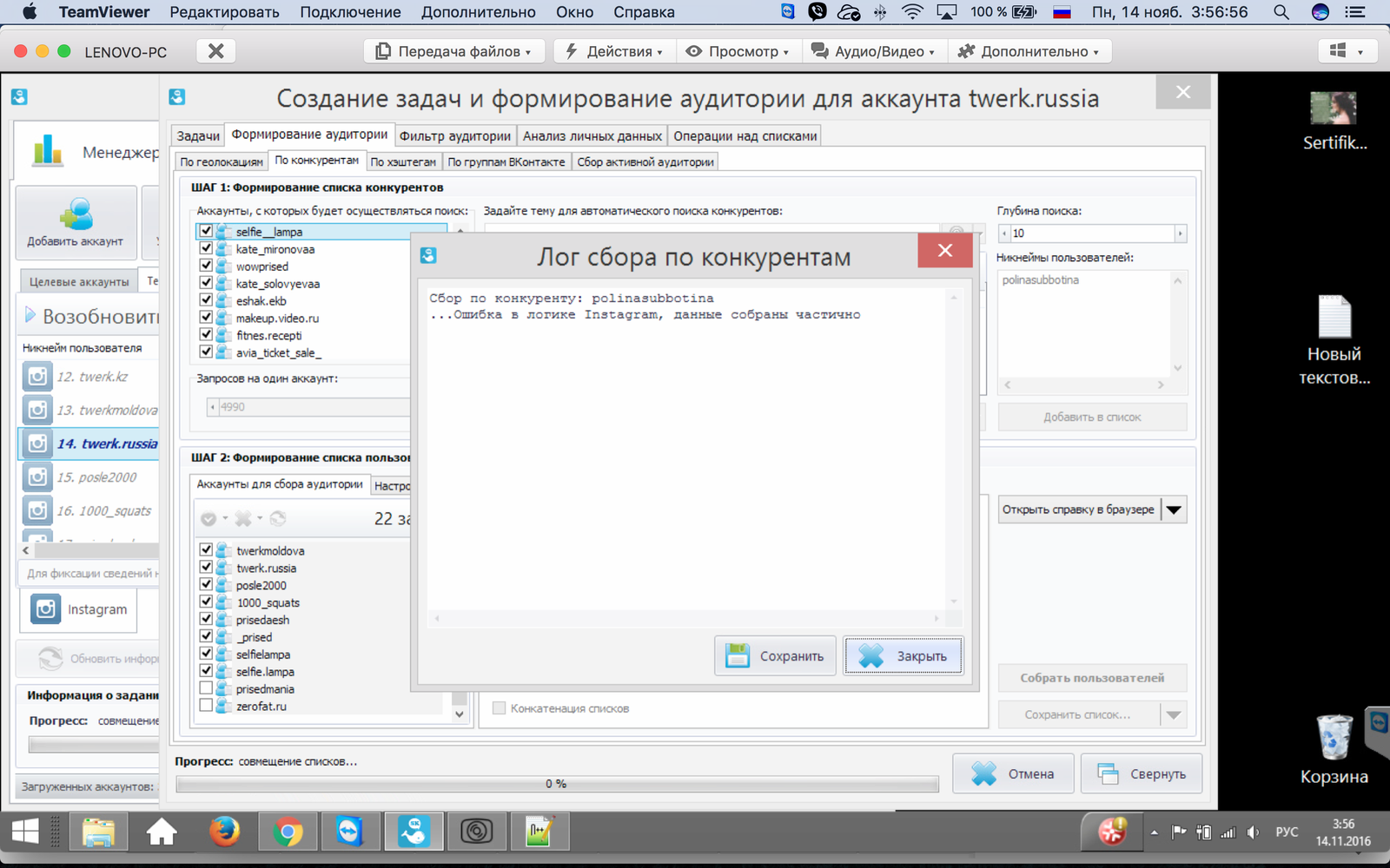 Чтобы в дальнейшем привести эту базу к виду id/login+ я загрузил ее в окно сбор по конкурентам в окошко формирования списка конкурентов и нажал обновить. программа думала какое то время и в итоге получился список содержащий 630 аккаунтов у которых высветился логин и кол-во публикаций/подписчиков/подписок. остальная часть базы 4370 аккаунтов стала N/A.
