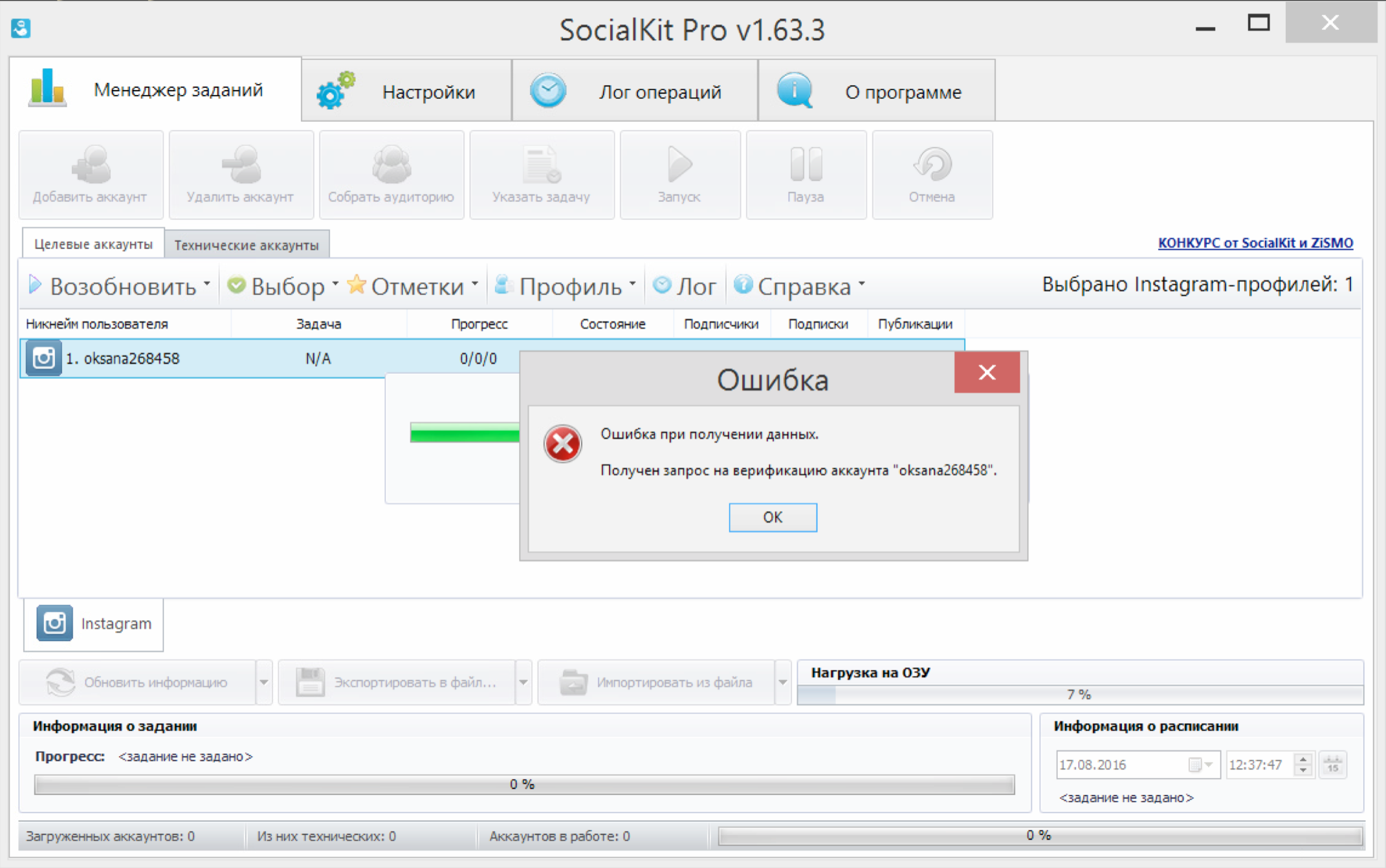 Так и сделали. Подписчики конкурента высветились. Но сбор не происходит. Задача начинается и тут же завершается. Тех аккаунт используем один, он проверен перед началом работы. Скриншот.